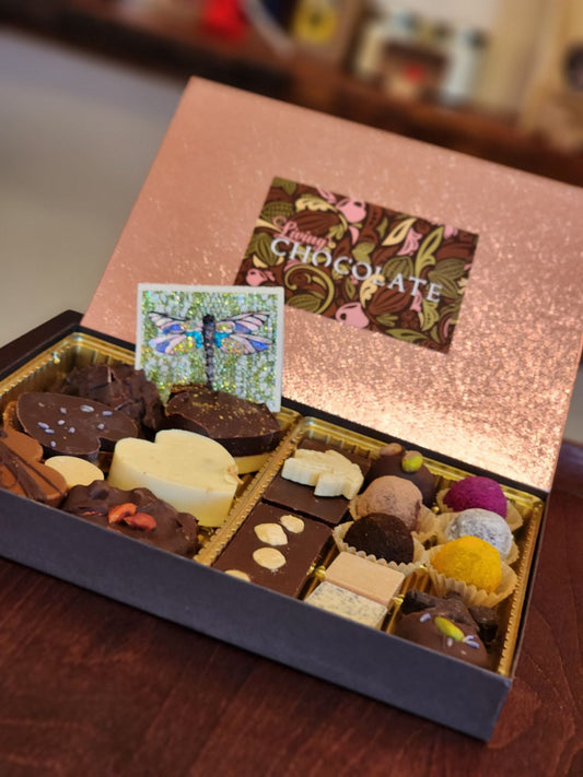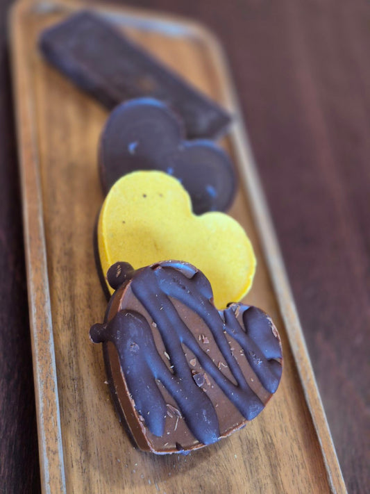 Our chocolates are not diluted with cacao butter or other oils or emulsifiers, unlike most chocolates. The raw beans are ground, sweetened and served. For this reason our chocolates are exponentially richer in satisfaction and mineral intake. We are certain you will enjoy them more slowly finding satiation more quickly. In addition honey does not trigger the dopamine receptors in the way that white sugar does. You may find yourself able to peacefully back away from the box a little sooner. 😉